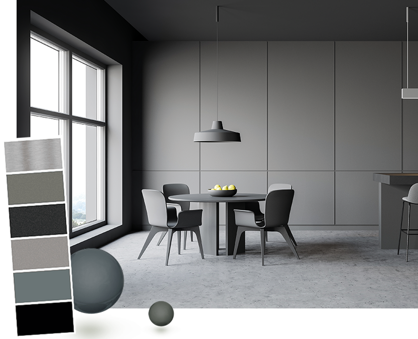 Pürüzlü, doğal yüzeyler rafine tasarımlarla kontrast oluşturur. Cilalı taş yüzeylerle karıştırılan pürüzlü beton dokular çok duyulu bir deneyim yaratır. Siyah ve koyu gri tonları, grafit ve taupe mistik bir evin anahtarıdır. Tek renkli odalar koyu mavi tonları ve fırçalanmış metal ile vurgulanmıştır. Sessiz renk paleti, kişisel ritüeller ve sağlıklı yaşam için sakin bir alan yaratıyor.